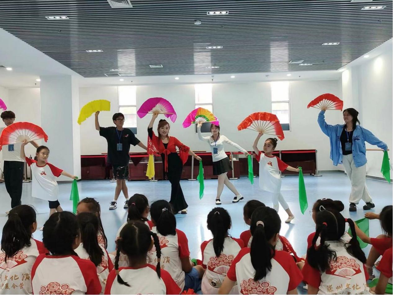 在和李艷老師交流后,隊(duì)員們也參與到秧歌的學(xué)習(xí)中。膠州秧歌以三彎九動(dòng)十八態(tài)的風(fēng)格動(dòng)律展現(xiàn)舞蹈動(dòng)態(tài)過程中力的延伸之美,強(qiáng)調(diào)“三道彎”的體態(tài)特征。起初,隊(duì)員們還手忙腳亂難以跟隨,但在李艷老師的指導(dǎo)下,他們很快找到技巧和節(jié)奏,通過和小朋友們的反復(fù)練習(xí)后掌握了一段基礎(chǔ)的秧歌舞蹈,感受到了學(xué)習(xí)非遺文化的樂趣。