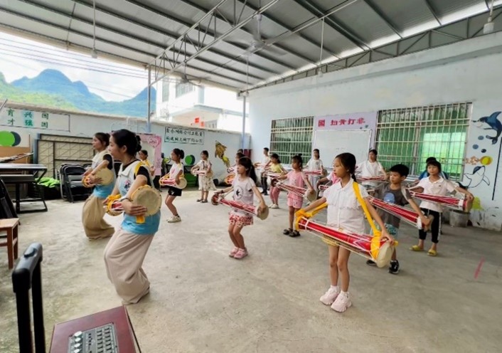 。文藝組結合連南瑤族自治縣樂瑤社會工作服務中心舉辦的連南“七彩假期,舞動瑤山”成長營的課程需求及參課學生的身心發(fā)展規(guī)律進行授課教學?;谇捌诓娠L調研,團隊成員巧妙地將瑤族舞蹈元素與體育舞蹈元素相結合,原創(chuàng)編排出一套既富有民族特色又適合學生練習的瑤族大長鼓舞韻律操,有效地促進了以美育人的教學成效。