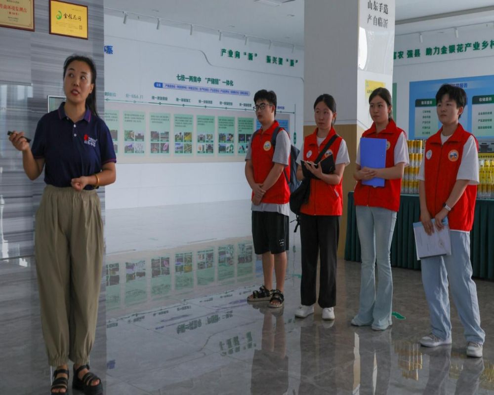 實(shí)踐團(tuán)隊(duì)了解到公司立足平邑縣金銀花道地產(chǎn)區(qū)優(yōu)勢(shì),從源頭做起,再到大健康產(chǎn)品,形成了中藥材為主的完整產(chǎn)業(yè)鏈條。平邑縣是金銀花的原產(chǎn)地和主產(chǎn)區(qū),金銀花現(xiàn)有種植面積65萬畝,年產(chǎn)干花1.8萬噸,產(chǎn)量占全國的60%。但一直以來,平邑縣都以買原料賣原料,缺少精深加工,急需補(bǔ)煉強(qiáng)煉提檔升級(jí),山東中平藥業(yè)有限公司借助平邑金銀花原產(chǎn)地的優(yōu)勢(shì),通過產(chǎn)業(yè)化平臺(tái)打造建成集種植、加工、研發(fā)、生產(chǎn)、檢測、倉儲(chǔ)、物流和追溯于一體的現(xiàn)代化金銀花健康產(chǎn)業(yè)園以及全面優(yōu)化提升中藥全生命周期的現(xiàn)代化產(chǎn)業(yè)園。充分的運(yùn)用金谷供應(yīng)鏈平臺(tái),使所有的板塊緊密的聯(lián)系在一起,協(xié)同發(fā)展,不斷拉長產(chǎn)業(yè)鏈條,形成循環(huán)模式,帶動(dòng)產(chǎn)業(yè)健康持續(xù)發(fā)展。