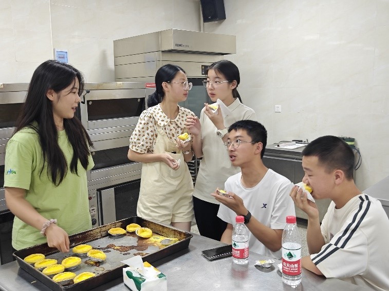 蛋撻烘烤完成后,小朋友們紛紛上前拿起充滿香氣的蛋撻,仔細(xì)品嘗兩種蛋撻的區(qū)別,并于志愿者們交流,共同探討。羅夢瑤小朋友這樣說到:“我覺得自制蛋撻更好吃一些,口感和奶香味都更豐富!”