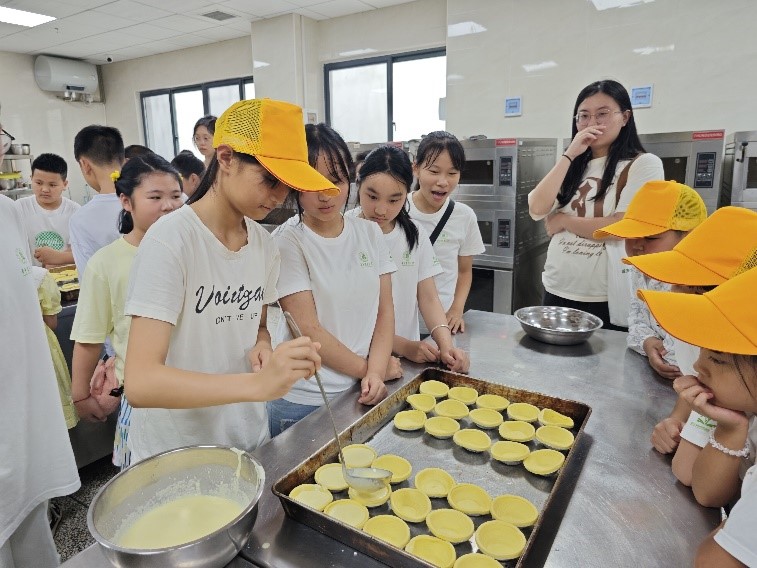 隨后,博士團(tuán)和孩子們來到烘焙房進(jìn)行蛋撻制作,志愿者們帶領(lǐng)小朋友們分成三組,并分別介紹制作過程中用到的原料,提醒小朋友們注意自制蛋撻液和成品蛋撻液在烘焙完成后的區(qū)別。小朋友們十分自覺主動的參與制作,完成了原料的稱量、仔細(xì)準(zhǔn)確的進(jìn)行蛋撻液的調(diào)配,將自制蛋撻液和成品蛋撻液進(jìn)行充分?jǐn)嚢?,有秩序的體驗(yàn)動手加蛋撻液的過程。