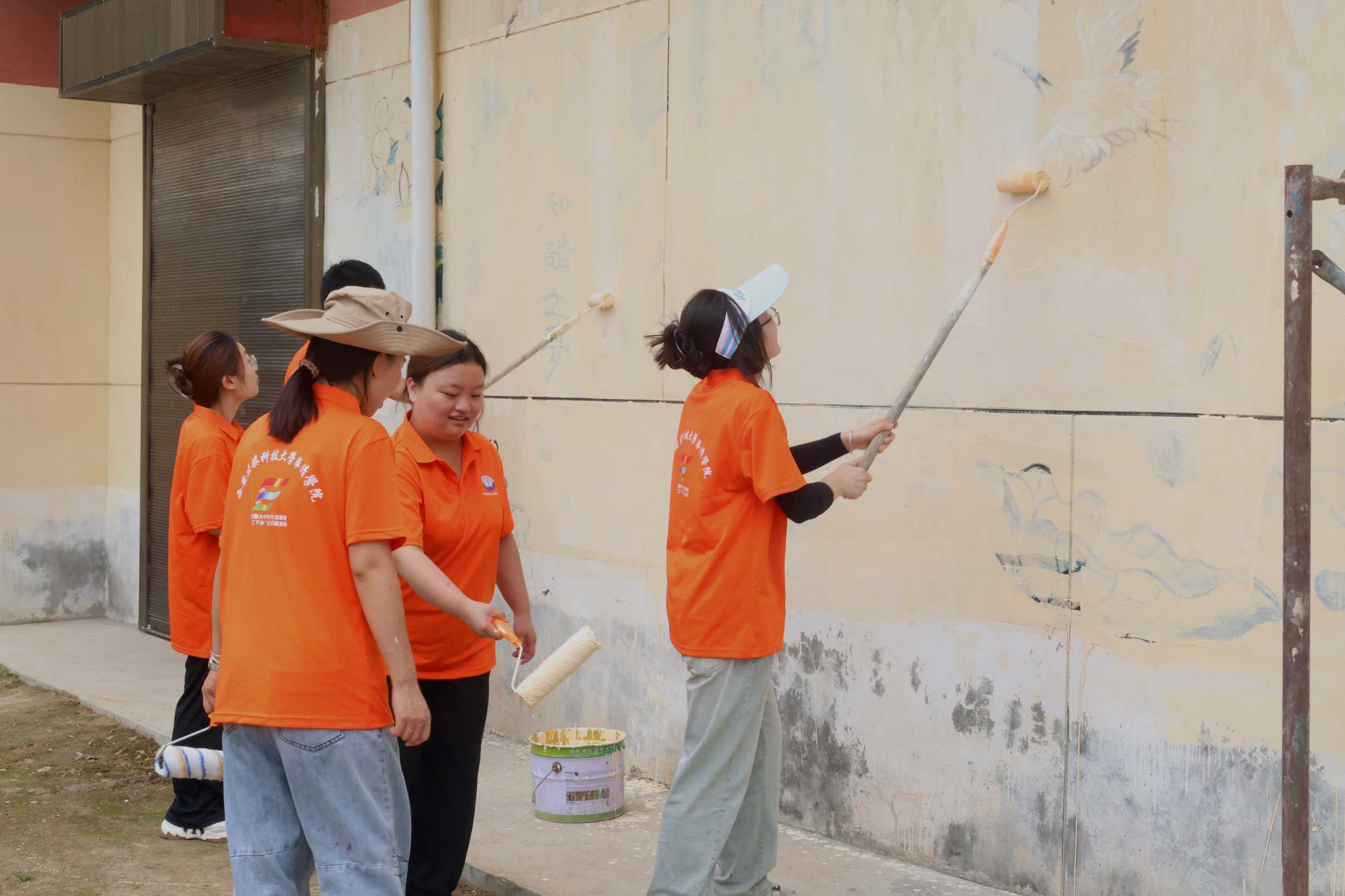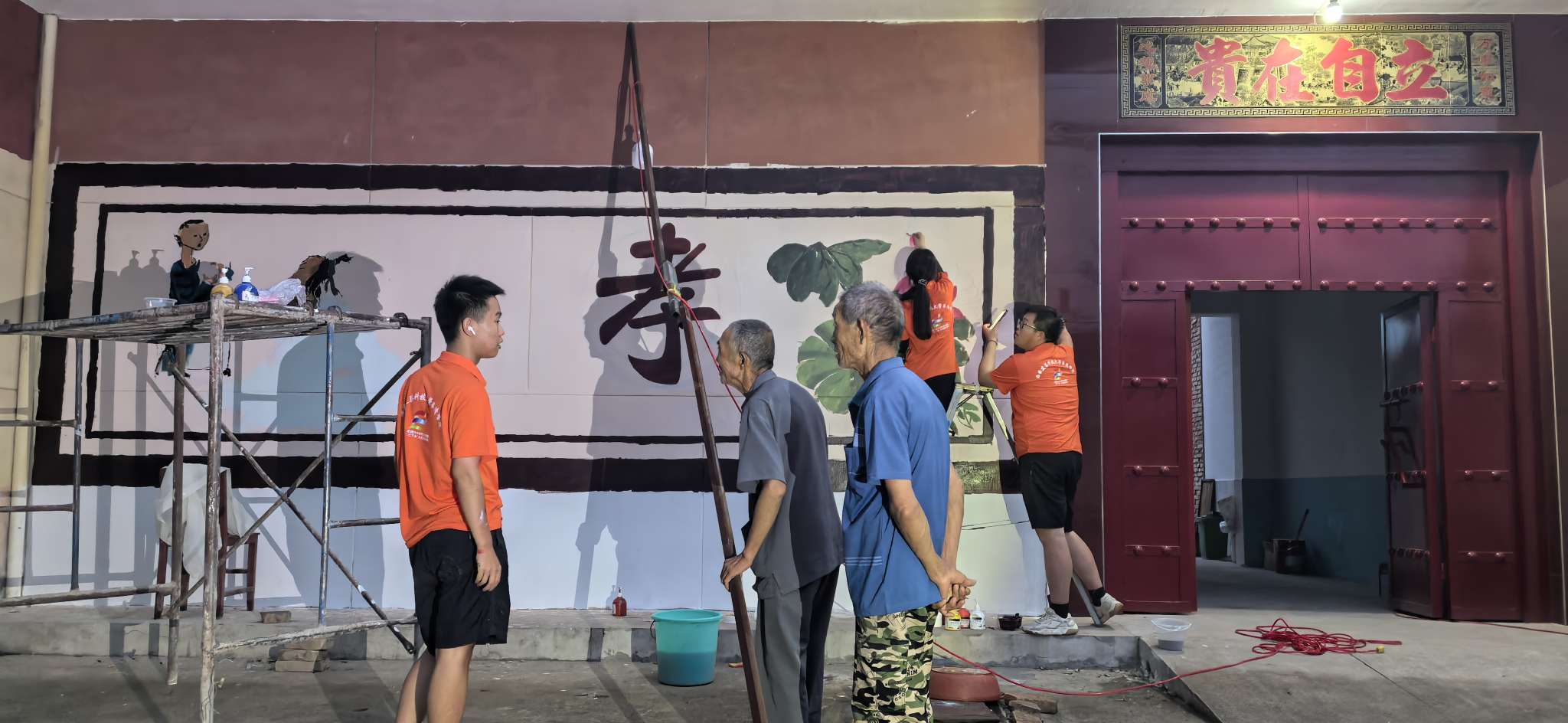 在墻繪創(chuàng)作過程中,天公不作美,大雨傾盆而下,但這并未澆滅實(shí)踐團(tuán)成員們的熱情與決心。雷牙村第二黨支部書記申金良和村民們紛紛伸出援手,為此次墻繪活動(dòng)做好后勤保障,給予了團(tuán)隊(duì)極大的支持與幫助。他們幫忙搬運(yùn)顏料、協(xié)助搭建腳手架、雨棚,在夜晚幫成員們撐起一盞明燈,場(chǎng)面十分溫馨。他們還表示:“這是我們自己的家鄉(xiāng),能為家鄉(xiāng)的文化建設(shè)出一份力,我們感到非常自豪。”
