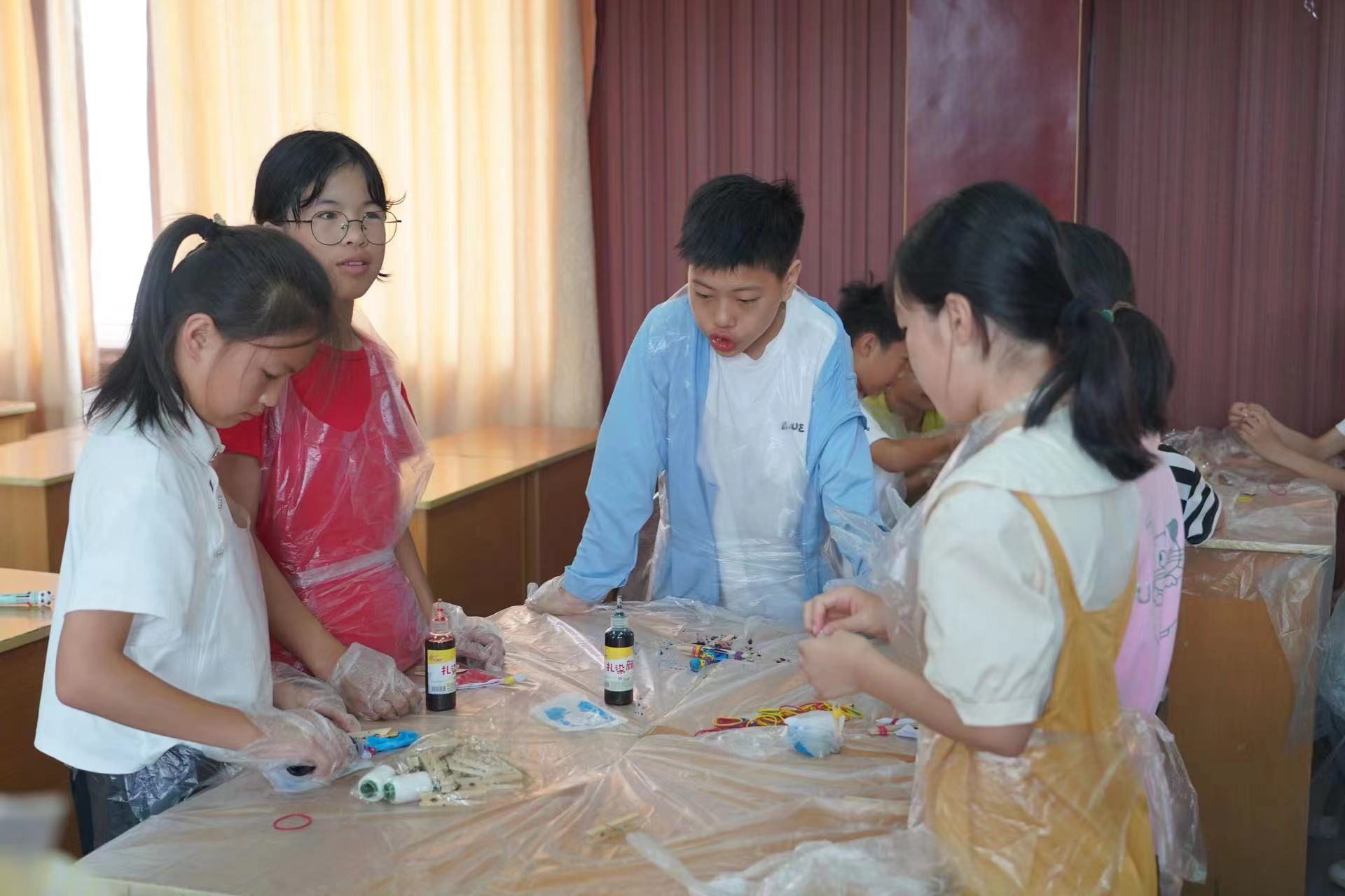 圖 2 同學(xué)們小組合作進(jìn)行扎染制作(滴水行動之遇見小分隊(duì) 卜天玥 供圖)