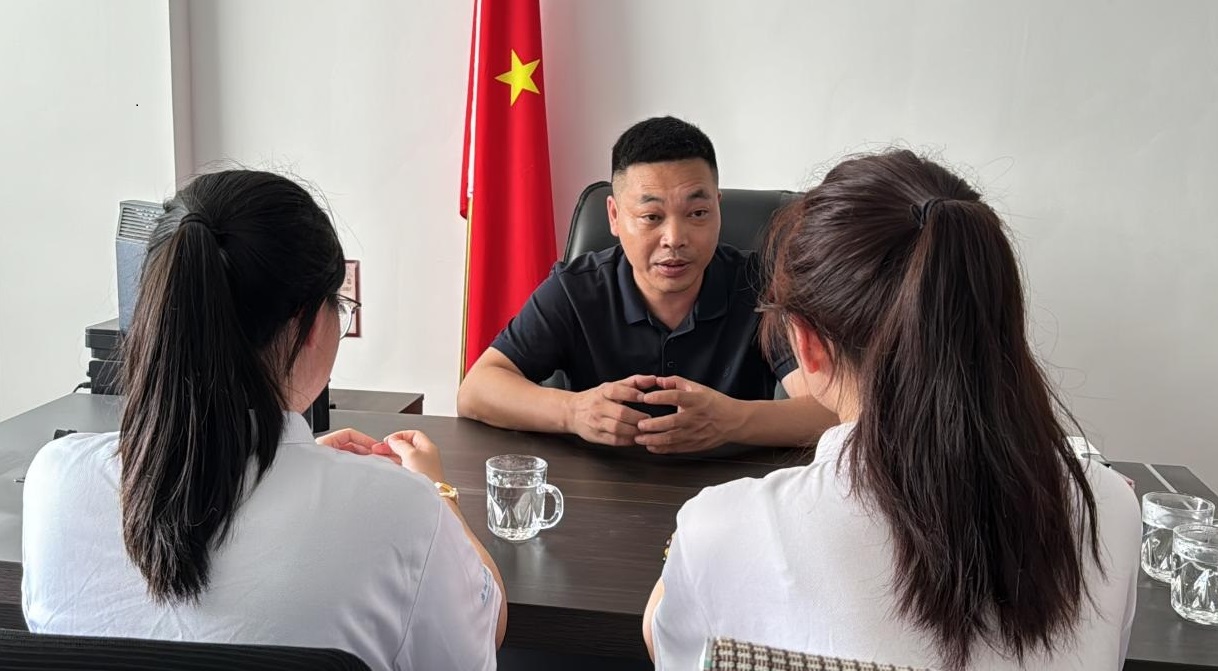 (圖為龍?zhí)勾妩h委書(shū)記曹?chē)?guó)杰與實(shí)踐隊(duì)成員面對(duì)面交談該村電子產(chǎn)業(yè)與農(nóng)文旅發(fā)展的具體現(xiàn)狀。吳慧玲 供圖)