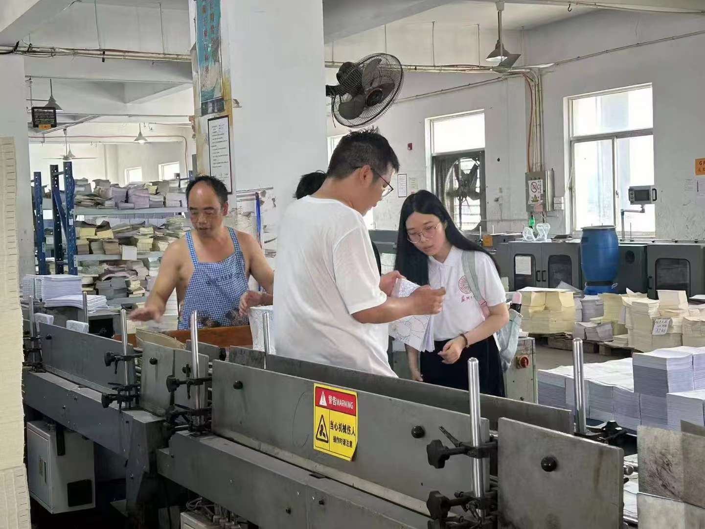 在封套車間中,成員親身體驗(yàn)了粘合工藝,將筆記本的封面與內(nèi)頁粘合,并了解到粘合過程中需控制粘合劑的用量以及均勻性,從而確保封套的牢固性和密封性。負(fù)責(zé)人指出,制作筆記本是一項(xiàng)細(xì)致而繁瑣的工作,在追求效率的同時(shí),不能讓質(zhì)量落后太遠(yuǎn)。
