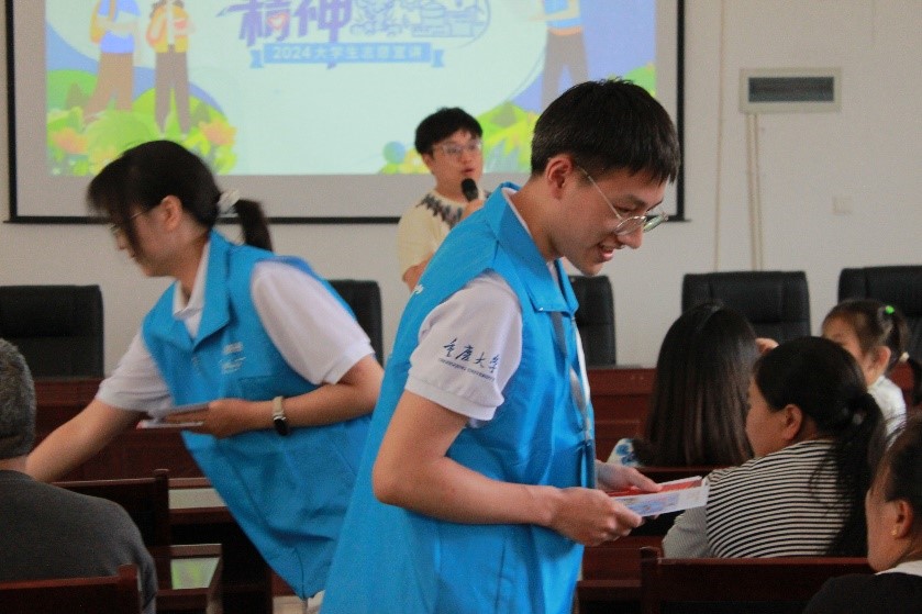 上午9時,新星宣講團的成員們身著藍色馬甲,佩戴工作證,在后坪鄉(xiāng)新時代文明實踐大講堂開展“兩彈一星”精神宣講。聽眾席上匯聚了多元的面孔:有耕耘在鄉(xiāng)間田野、臉龐上刻滿歲月痕跡的農(nóng)民伯伯,也有趁著假期歸鄉(xiāng)的莘莘學子,他們的笑容中交織對未知的好奇。