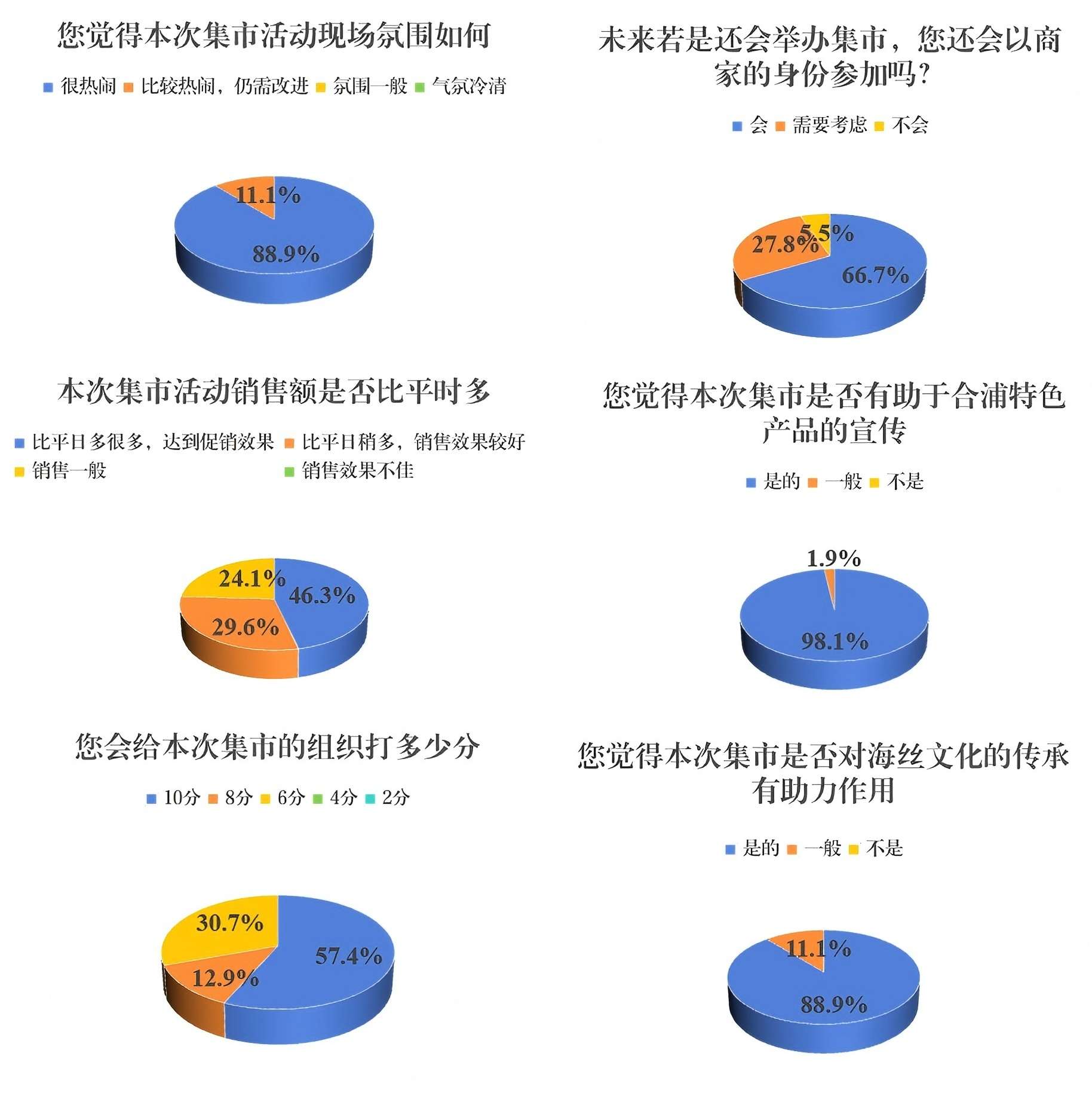 調(diào)研結(jié)果顯示,約90%的受訪者認(rèn)為本次集市的氛圍非常熱鬧。這表明本次集市在營造節(jié)日氛圍方面取得了顯著成效,吸引了大量游客和商家的參與。超過70%的受訪者認(rèn)為本次集市的組織非常優(yōu)秀。大部分商家繼續(xù)以商家身份參加未來的集市活動(dòng),這說明本次集市的組織工作得到了廣大商家的認(rèn)可,為未來的集市活動(dòng)奠定了良好的基礎(chǔ)。在銷售額方面,超過75%的商家表示本次集市的銷售額大于平時(shí)。這表明本次集市在促進(jìn)農(nóng)產(chǎn)品銷售方面取得了顯著成效,為商家?guī)砹丝捎^的收益。對(duì)于本次集市的組織評(píng)分,57.4%的受訪者給出了8分,30.7%的受訪者給出了6分,12.9%的受訪者給出了4分,無人給出2分。這表明本次集市的組織工作總體上得到了受訪者的認(rèn)可,但仍有一定的提升空間。同時(shí),在文化宣傳方面,約90%的受訪者認(rèn)為本次集市對(duì)合浦文化的宣傳起到了積極的作用,這表明本次集市不僅是一個(gè)農(nóng)產(chǎn)品展銷的平臺(tái),更是一個(gè)傳播和弘揚(yáng)合浦文化的重要窗口。
