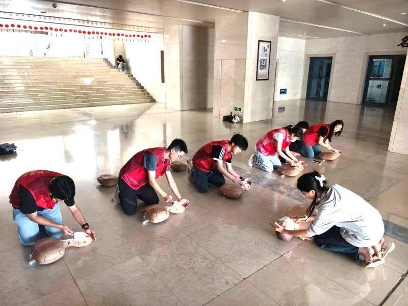 理論教學(xué)后,實操環(huán)節(jié)迅速展開。兩隊隊員混合編組,在模擬人身上交替練習(xí)。“手臂再直一些,用身體重量下壓!”“萬眾醫(yī)心”隊員余元元半蹲指導(dǎo),手把手糾正“暖陽陽”隊員的按壓姿勢。隨著練習(xí)深入,科教樓大廳回蕩起此起彼伏的計數(shù)聲,不同顏色的隊服在急救模型前交織成守護生命的同心圓。