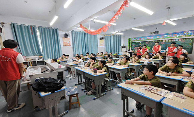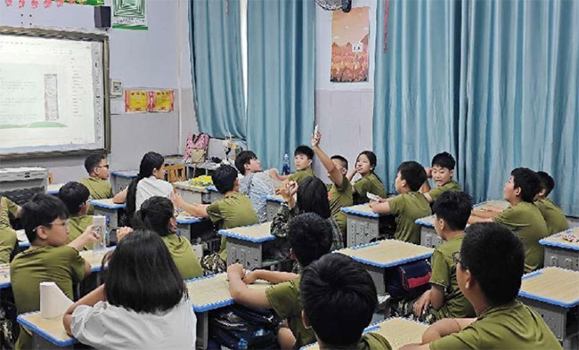 經(jīng)過(guò)大致的講解,學(xué)生們對(duì)絞胎瓷都有了濃厚的興趣。屏幕上播放著一段精心剪輯的視頻:一雙手先是將一團(tuán)白泥和一團(tuán)赭色的泥用力地揉壓在一起,但并不完全混合,仿佛在揉一塊巨大的大理石紋蛋糕。接著,這團(tuán)融合的泥土被巧妙地拉伸、扭轉(zhuǎn)、折疊,每一次動(dòng)作都引得臺(tái)下發(fā)出一陣低低的驚呼。最后,這團(tuán)充滿了奇妙紋路的泥被置于拉坯機(jī)上,隨著轉(zhuǎn)盤(pán)的旋轉(zhuǎn)和工匠雙手的引導(dǎo),一個(gè)花瓶的形狀漸漸顯現(xiàn),而它表面的花紋也隨之流動(dòng)、變幻,如同有了生命一般,最終定格成獨(dú)一無(wú)二、無(wú)法復(fù)制的絢爛圖案在互動(dòng)環(huán)節(jié),學(xué)生們踴躍分享,一名女孩清晰列舉絞胎瓷獨(dú)特之處,贏得了熱烈的掌聲。隊(duì)員們送上零食,現(xiàn)場(chǎng)氛圍熱烈。