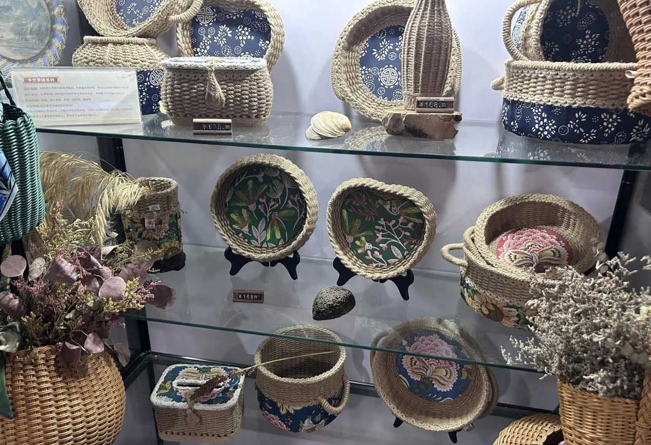 調(diào)研伊始,在劉梅老師的熱情接待下,團(tuán)隊(duì)成員首先參觀了苧麻編織非遺展館。館內(nèi)陳列的手工制品琳瑯滿目,兼具實(shí)用與美學(xué)價(jià)值:精致玲瓏的苧麻小傘透著江南靈秀,針腳細(xì)密的手工鞋墊藏著生活暖意,造型別致的果籃盡顯自然肌理,還有融入現(xiàn)代設(shè)計(jì)的苧麻文創(chuàng)產(chǎn)品,每一件作品都凝結(jié)著匠人的心血與智慧。團(tuán)隊(duì)成員通過(guò)觸摸苧麻制品的紋理,直觀觀察到傳統(tǒng)編織工藝的細(xì)節(jié)精度,進(jìn)一步理解了劉梅老師提出的“手工制品承載不可復(fù)制溫度”的工藝?yán)砟睢?/span>