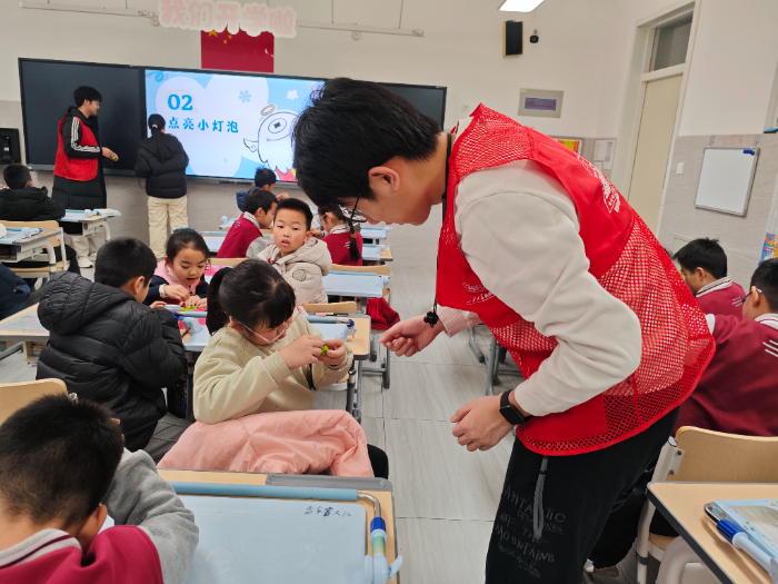 很快,串聯(lián)電路就搭建完成了。當(dāng)小王喊出“大家可以閉合開關(guān)試試?yán)?rdquo;,孩子們紛紛按下開關(guān),原本黯淡的小燈泡瞬間亮起暖黃的光芒。“亮了!亮了!”教室里立刻響起此起彼伏的歡呼聲,一張張小臉上滿是純粹的喜悅,熱切感染著在場的每一位志愿者。