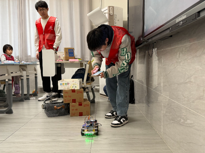 我深吸一口氣,給智能小車裝上電池,打開手機藍(lán)牙成功連接后,輕輕點下“前進(jìn)”鍵。下一秒,小車穩(wěn)穩(wěn)地向前駛?cè)?,還靈活地轉(zhuǎn)了個彎,完全符合預(yù)期!教室里瞬間爆發(fā)出雷鳴般的歡呼聲,孩子們激動地拍著小手,有的甚至站起來踮著腳尖張望。就在這時,一個小男孩興沖沖地跑到講臺邊,仰著小臉滿眼期待地問:“哥哥,這個小車是怎么做的呀?我以后也想親手做一個!”我蹲下身輕輕地摸了摸他的頭,耐心地跟他講解了基本原理,看著他似懂非懂卻格外認(rèn)真的模樣,心里涌起一股暖流。