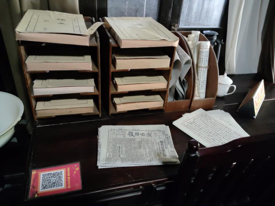 圖為《救亡日報》舊址辦公桌上貼有二維碼講解 黃嘉鈺攝