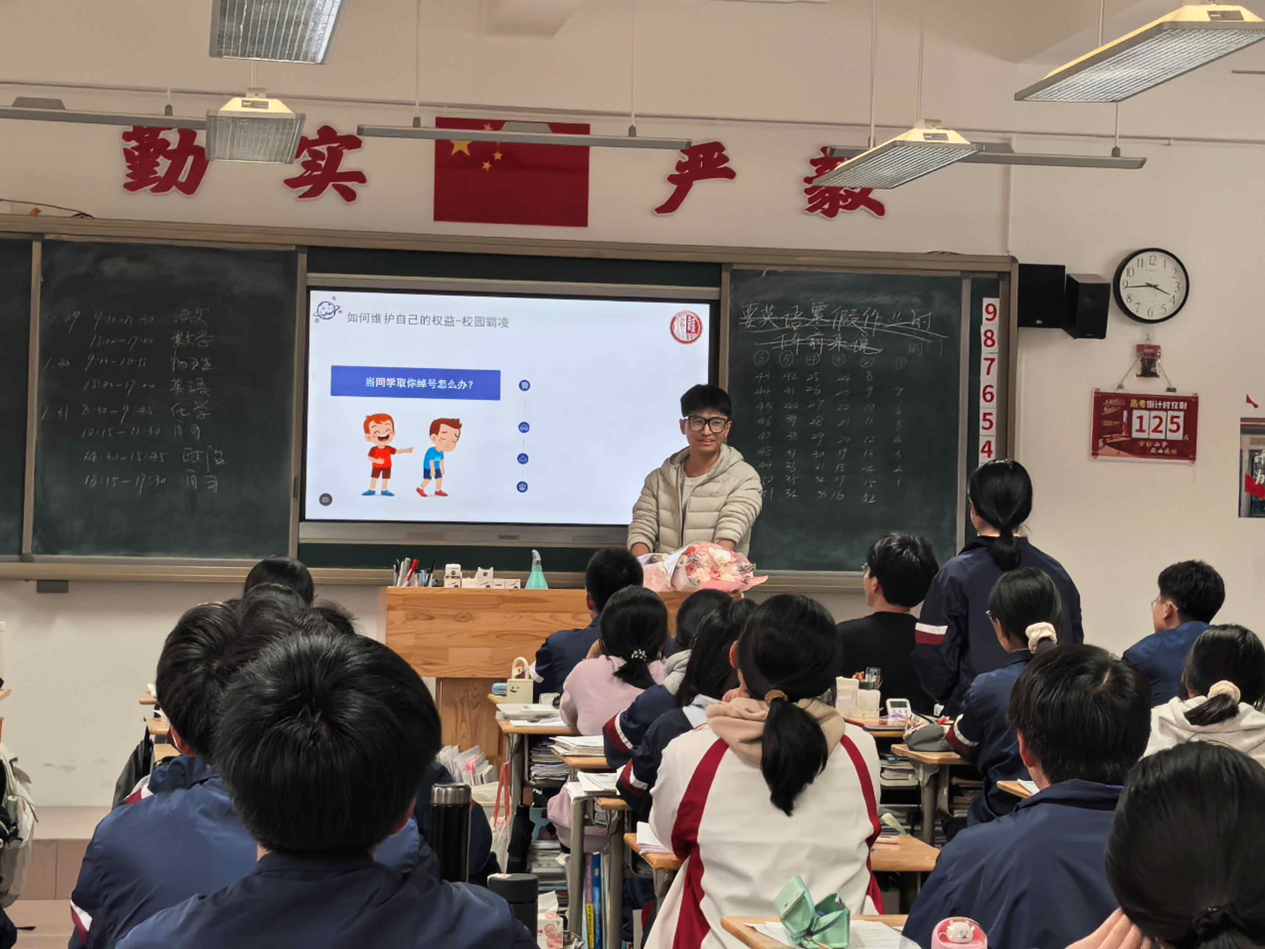 緊接著,宣講員汪偉釗圍繞“校園霸凌以及如何自救”進(jìn)行深度解讀。他結(jié)合校園生活中的真實(shí)案例,明確了校園霸凌的法律定義、表現(xiàn)形式及危害后果,重點(diǎn)傳授了遭遇霸凌時(shí)的自我保護(hù)方法——包括及時(shí)向老師家長(zhǎng)求助、保留證據(jù)、合法維權(quán)等關(guān)鍵步驟,鼓勵(lì)同學(xué)們勇敢對(duì)校園霸凌說(shuō)“不”,學(xué)會(huì)用智慧和法律保護(hù)自己。