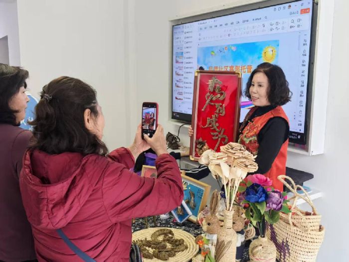 除了切身觀摩與聆聽講解,成員們還在于老師的指導(dǎo)下親身參與體驗了草編創(chuàng)作。不過是簡單的扎與結(jié),幾片玉米葉就化作了栩栩如生的小金魚。“這下?lián)裢瓴耸O碌娜~子也有用了!”現(xiàn)場一位阿姨驚喜地說。
