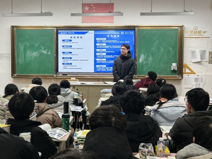 活動(dòng)當(dāng)日,由鄒艾家?guī)ьI(lǐng)的團(tuán)隊(duì)與校方順利對(duì)接后,迅速進(jìn)入班級(jí)開展宣講。鄒艾家作為主講人,通過圖文并茂的PPT,系統(tǒng)介紹了蘇州工學(xué)院的整體辦學(xué)情況,并著重闡述了師范學(xué)院在人才培養(yǎng)、師資力量、實(shí)踐教學(xué)以及就業(yè)發(fā)展等方面的突出優(yōu)勢(shì)。她結(jié)合師范生的學(xué)習(xí)體驗(yàn)與成長收獲,生動(dòng)描繪了大學(xué)階段專業(yè)學(xué)習(xí)與綜合素質(zhì)提升的路徑,激發(fā)了在場(chǎng)學(xué)子對(duì)未來學(xué)業(yè)生涯的思考與向往。
