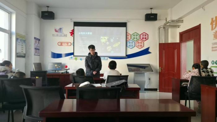 課堂伊始,當(dāng)投影幕布上緩緩浮現(xiàn)出藍(lán)色的地球,太陽系的八大行星沿著軌道緩緩運(yùn)轉(zhuǎn),原本喧鬧的教室瞬間陷入寂靜,二十多雙清澈的眼睛緊緊盯著畫面,眼里盛滿了從未有過的好奇與震撼。這堂長(zhǎng)達(dá)45分鐘的宇宙漫游,支教團(tuán)成員從孩子們腳下的地球出發(fā),一步步帶領(lǐng)他們走進(jìn)更廣闊的星際空間——講解太陽系的運(yùn)轉(zhuǎn)規(guī)律,細(xì)數(shù)木星表面的斑斕條紋,描摹土星環(huán)的璀璨壯闊,訴說銀河螺旋臂的神秘浩瀚,更用生動(dòng)的語言,解讀中子星的極致密度、黑洞的無窮引力。