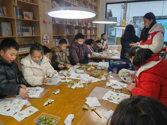 手工課堂上,創(chuàng)意與溫情交織,孩子們在動手實(shí)踐中感受美、創(chuàng)造美。隊(duì)員楊成希帶來剪紙課程,兼顧不同的難易程度,既有精巧窗花,也有可愛的小動物圖案,適配不同年齡段孩子。課堂上,楊成希手把手示范指導(dǎo),孩子們主動提問、互相協(xié)助,彩紙?jiān)谥讣夥w,變成一件件獨(dú)具特色的剪紙作品。陳蝴蝶帶來的植物拓染課程,讓孩子們在自然中發(fā)現(xiàn)美好。她給孩子們講解了拓染原理,引導(dǎo)大家將花草固定在白布上,通過敲打暈染出自然的紋樣。藍(lán)、紫、黃的花朵印記,形態(tài)各異的小草圖案,經(jīng)孩子們巧妙搭配,拼接成美麗的圖案??粗H手完成的作品,孩子們臉上滿是自豪,也在潛移默化中學(xué)會觀察自然、欣賞自然之美。