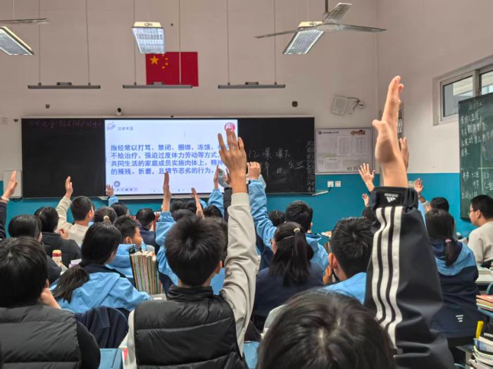 為了提高活動的參與度與趣味性,現(xiàn)場設(shè)置了“有獎問答”活動,如“我當小法官”“看解釋猜法律術(shù)語”等互動環(huán)節(jié)。“未滿16周歲的小美可以開網(wǎng)絡(luò)直播嗎?”“遭遇校園欺凌后該怎么辦?”志愿者接連拋出與學生息息相關(guān)的法律問題,同學們踴躍舉手、積極搶答,在輕松的游戲中鞏固了法律知識,深化了對法治理念的理解。互動結(jié)束后,志愿者為參與答題的學生送上小禮品,鼓勵大家爭做“知法、懂法、守法、用法”的時代新青年。