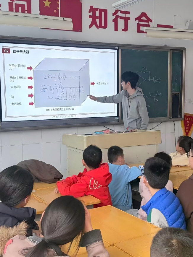 器件產(chǎn)生的電信號(hào)微小而復(fù)雜,如何讓它“說(shuō)話”?第二位同學(xué)以“腦袋”為比喻,講解了電路系統(tǒng)的作用。他展示了我們項(xiàng)目中的的信號(hào)處理模塊。當(dāng)孩子們親眼看到模擬摔倒動(dòng)作觸發(fā)警報(bào)燈閃爍時(shí),現(xiàn)場(chǎng)響起了陣陣驚嘆。這一環(huán)節(jié)讓青少年認(rèn)識(shí)到,再前沿的科技也離不開(kāi)扎實(shí)的硬件基礎(chǔ),每一個(gè)“智能”背后都是精準(zhǔn)的電路設(shè)計(jì)。