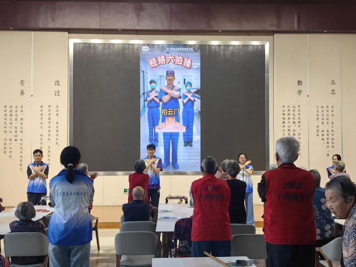 針對(duì)老年群體身體機(jī)能特點(diǎn),志愿者開展經(jīng)絡(luò)六拍操教學(xué)服務(wù)。教學(xué)過(guò)程中,志愿者對(duì)經(jīng)絡(luò)六拍操的動(dòng)作要領(lǐng)、養(yǎng)生原理及各動(dòng)作功效進(jìn)行說(shuō)明,通過(guò)慢速示范、動(dòng)作拆解的方式進(jìn)行教學(xué),同時(shí)采取分組指導(dǎo)的形式,對(duì)老年群體的動(dòng)作進(jìn)行規(guī)范糾正,幫助參與老人掌握基礎(chǔ)動(dòng)作流程。現(xiàn)場(chǎng)老年群體跟隨示范進(jìn)行練習(xí),完成基礎(chǔ)健身實(shí)操。
