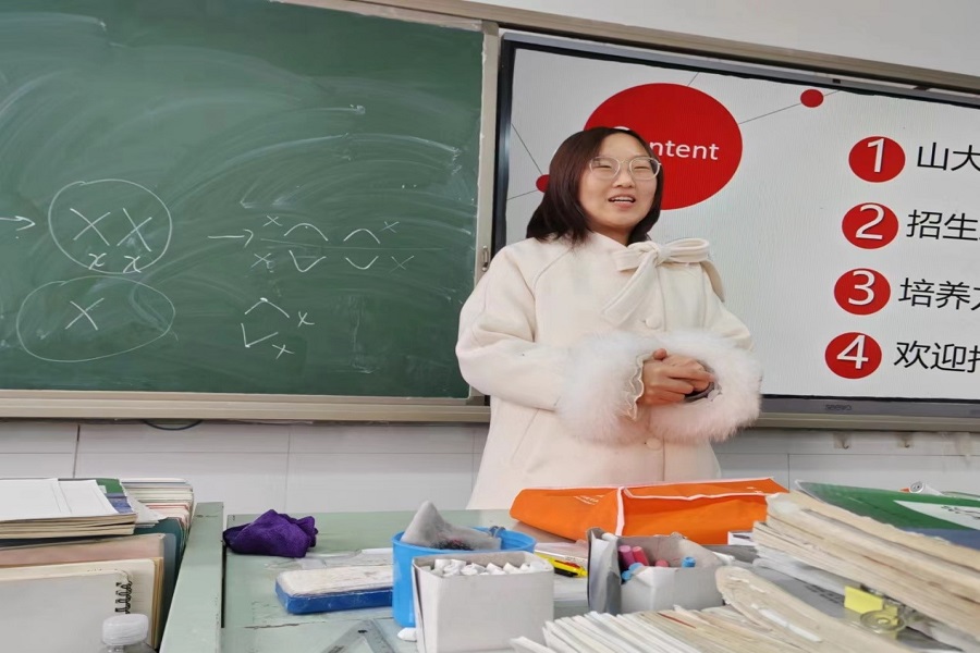 在衡水市第二中學,團隊成員畢佳旭同學與學弟學妹們就個人成長、高考復習、報考經(jīng)驗、就讀體驗、招生政策等方面進行交流與互動,在幫助學弟學妹們明晰高考目標的同時講好山大故事,樹立山大形象,講好山大成績;