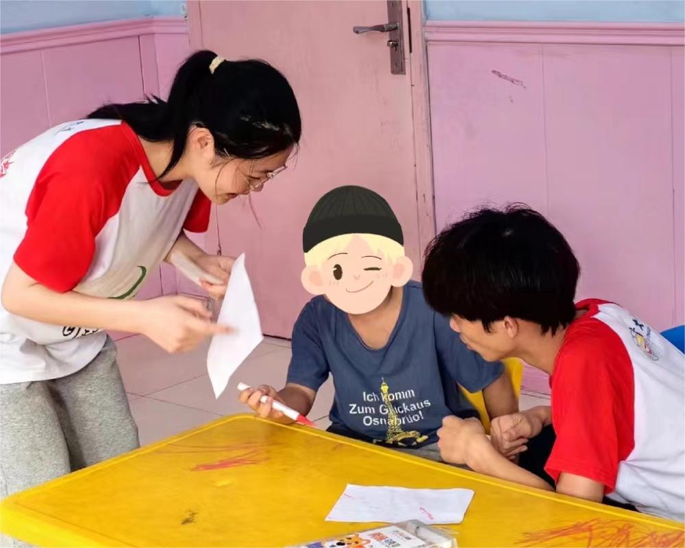 “一閃一閃亮晶晶,滿天都是小星星,掛在天上放光明,好像許多小眼睛。” 課堂伊始,三位志愿者以一首《小星星》歌曲為引,為孩子們營造一個輕松愉悅且濃厚的英語學(xué)習(xí)氛圍。隨后,他們給每個孩子分發(fā)了一張印有五角星圖案的空白紙張并教授孩子們“星星”的中英文。為了培養(yǎng)孩子們的專注力,他們又分發(fā)了各種顏色的畫筆,一對一引導(dǎo)孩子們?yōu)樾切巧仙?br />康復(fù)中心的一位老師真誠地說道,由于每個孩子的情況各不相同,在課堂上他們的表現(xiàn)也呈現(xiàn)出明顯的個體差異,因此也希望社會各界能夠更多地關(guān)注和支持殘疾兒童教育事業(yè),共同為他們的美好未來貢獻(xiàn)力量。
