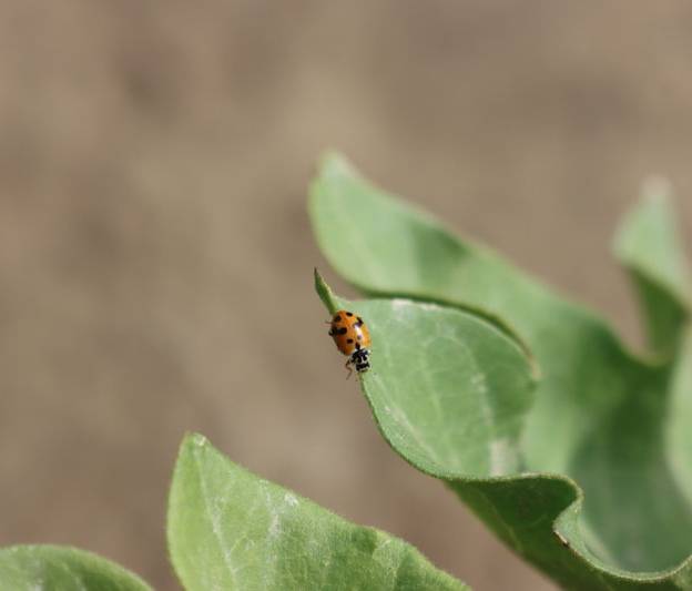 星火實(shí)踐小隊(duì)隊(duì)長聶磊在下地觀察棉花長勢時(shí)發(fā)現(xiàn)了葉子上爬行的瓢蟲,張福生笑著談到:瓢蟲不吃棉花,瓢蟲是益蟲,瓢蟲吃蚜蟲,葉子上黑黑一片的是蚜蟲,有瓢蟲說明除蟲措施做得還是比較好的。