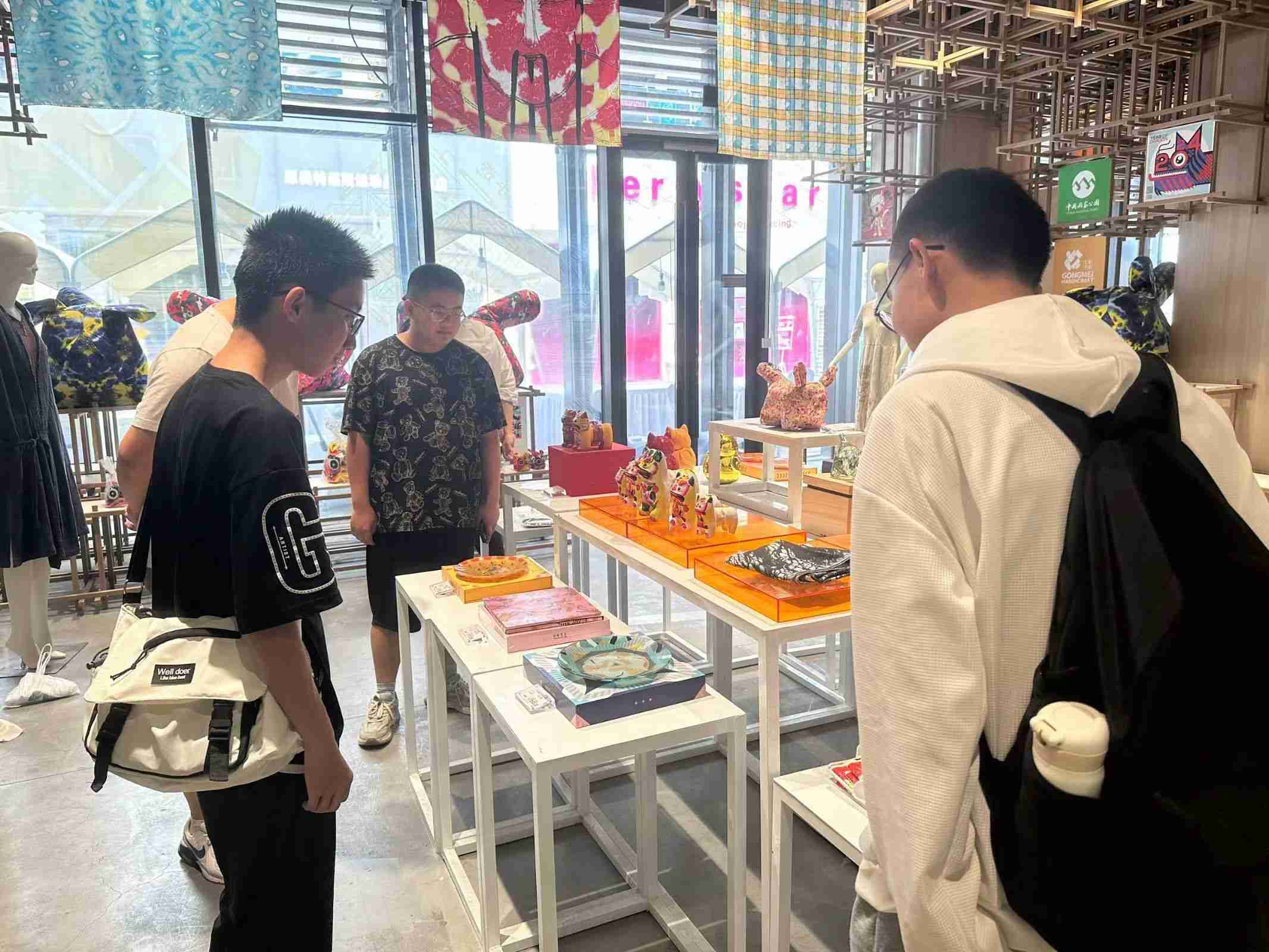 隨后,實踐隊隊員們隨著王老師的步伐進入到了手造中心的二層。在這里,各式各樣的吆喝聲此起彼伏:“磨剪刀鏘菜刀嘍!”“賣糖葫蘆嘍,酸酸甜甜的糖葫蘆”,聽著這些吆喝聲,隊員們仿佛回到了上世紀八九十年代。手造中心的二層以“齊魯手造”為主題,打造了山東16市的展示門店,匯聚山東16市的手造精品。隊員們走入不同地市的展示門店,感受不同地市的手造文化。手造中心以可聽、可視、可參與的形式,打造出了沉浸式、互動式、場景化的展銷空間。