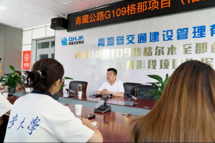在青海省交通建設(shè)管理有限公司,與長安大學(xué)1999級(jí)校友,省交建公司黨委委員、副總經(jīng)理,G109指揮部指揮長余海龍進(jìn)行交流座談。余海龍向?qū)嵺`隊(duì)詳細(xì)介紹了青藏公路G109線格爾木至那曲段提質(zhì)改造工程的項(xiàng)目概況與建設(shè)意義。“做這一行是很苦很累的,對(duì)人的生理和心理方面都是一種挑戰(zhàn),但是當(dāng)我們走在自己參與和主持修建的路上,那種獲得感和滿足感是別人無法比擬的”,余海龍表示,“在長安大學(xué)學(xué)習(xí)的過程中,培養(yǎng)了我公路人的決心和勇氣,讓我一直堅(jiān)守本心、踐行使命,不忘修好每條路、服務(wù)好群眾的理念”。