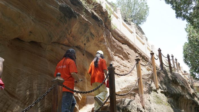 圖為團(tuán)隊(duì)正在觀察王母宮石窟。王梓帆 供圖