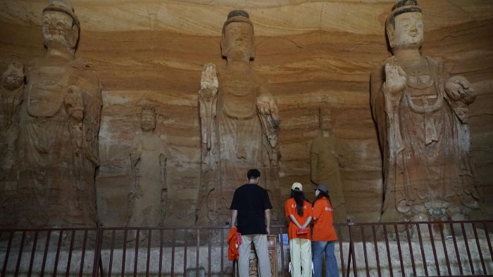 作為古絲綢之路東段的重要遺址,王母宮石窟的造像中還能看到多元文化交融的痕跡——佛像的發(fā)髻樣式、衣飾褶皺中,既有中原傳統(tǒng)雕刻的細(xì)膩,又隱約可見西域藝術(shù)的豪放。團(tuán)隊(duì)成員在講解員的指引下,仔細(xì)辨認(rèn)著這些文化交流的“密碼”,深刻體會(huì)到石窟作為文明對(duì)話載體的獨(dú)特價(jià)值??邇?nèi)設(shè)置的溫濕度傳感器、小型除濕設(shè)備等現(xiàn)代化保護(hù)設(shè)施,也讓大家直觀感受到科技在延緩文物老化中的作用,對(duì)“保護(hù)為先”的理念有了更具體的認(rèn)知。