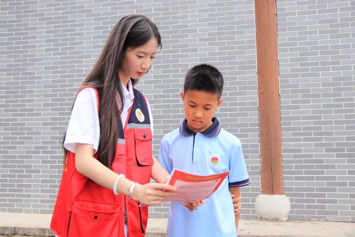 (圖為服務(wù)隊(duì)成員向當(dāng)?shù)鼐用穹职l(fā)紅色宣傳單并介紹)