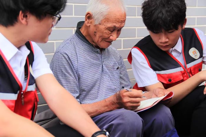 (圖為服務(wù)隊(duì)成員與廖開(kāi)華老人交流感悟)