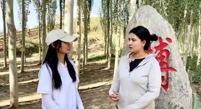 7月6日,實(shí)踐團(tuán)抵達(dá)麥蓋提縣后,在當(dāng)?shù)靥峁┑膶S媒煌ūU舷虑巴死敻缮衬吘売^測點(diǎn)。在這里,實(shí)踐團(tuán)看到曾經(jīng)飽受流沙侵蝕、嚴(yán)重威脅周邊生產(chǎn)生活空間的區(qū)域,經(jīng)過長期治沙工程的持續(xù)推進(jìn),如今已構(gòu)建起多層固沙林帶,展現(xiàn)出“林進(jìn)沙退”的顯著成效,讓隊(duì)員們直觀感受到治沙工程的偉大力量。 期間,實(shí)踐團(tuán)還跟隨防沙治沙中心護(hù)林員阿卜杜熱伊木?艾麥爾、阿布都卡迪爾?卡米力、阿布都沙拉木?艾爾肯里三人,詳細(xì)了解生態(tài)林的建立與維護(hù)體系。在與負(fù)責(zé)人肉孜萬姑?阿布都賽買提的交流中,隊(duì)員們知曉了當(dāng)?shù)刂紊彻ぷ鲝?ldquo;沙進(jìn)人退”到“林進(jìn)沙退”的歷史轉(zhuǎn)變,以及群眾依托生態(tài)資源,通過護(hù)林就業(yè)等方式實(shí)現(xiàn)增收的具體情況。這讓隊(duì)員們真切感受到,沙漠植被既是生態(tài)系統(tǒng)的守護(hù)者,更是民生發(fā)展的支撐載體,代代傳承的治沙實(shí)踐,正持續(xù)推動(dòng)生態(tài)保護(hù)與民生改善互促共進(jìn)。