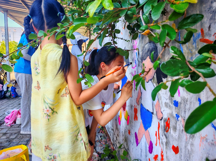 中午稍作休息后,下午兩點半,大家頂著烈日回到教室輔導孩子們寫暑假作業(yè),教室里鉛筆劃過紙頁的沙沙聲格外悅耳。四點后,陽光柔和了許多,大家又回到墻下,和孩子們一起完成創(chuàng)作。孩子們踮腳給云朵涂顏色,成員們幫忙修正圖案,顏料蹭到袖口、鞋子沾了泥點都不在意。當作品完成時,墻上的太陽對著小手印微笑,云朵旁飄著孩子們歪歪扭扭的名字,充滿了童真與活力。