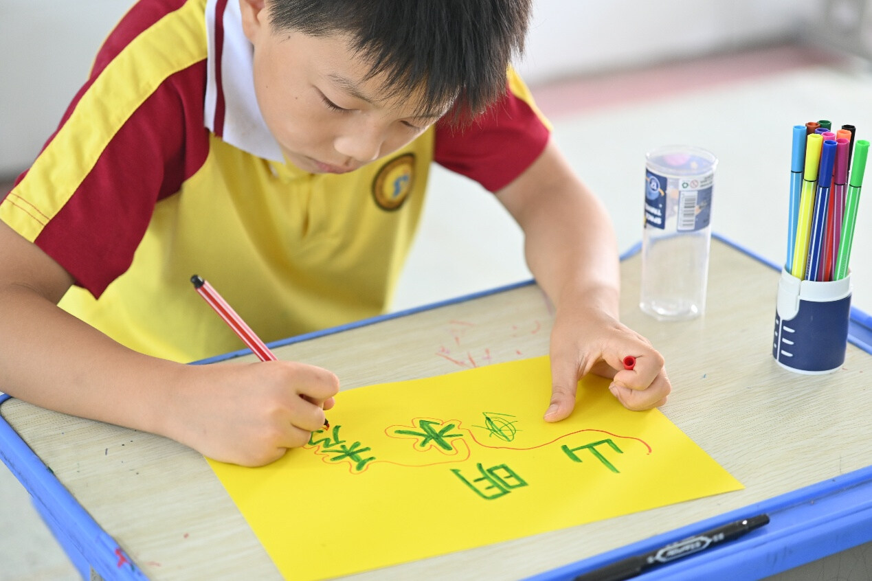 圖為小朋友正在手工課上寫下山明水秀的標(biāo)語 陳立志 農(nóng)姚 攝