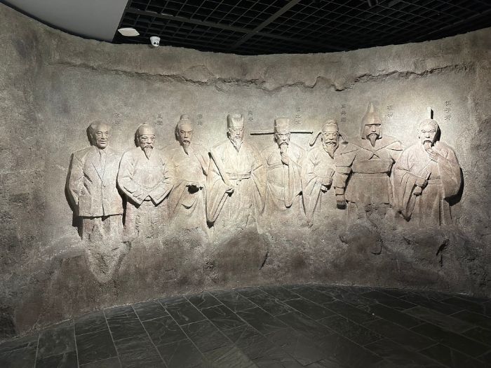 登上二樓,志愿者進(jìn)入“六朝京畿”和“人杰地靈”展區(qū)。“六朝京畿”展區(qū)以墓葬文物和陶器演變?yōu)橹黝},展示馬鞍山在六朝時期的獨特地位,這些文物無聲地訴說著社會變遷。“人杰地靈”展區(qū)則以石雕形式呈現(xiàn)了蘇里、夏燮、邢珣等歷史名人。這些人物或以文治武功彪炳史冊,或以高風(fēng)亮節(jié)流傳后世,他們的事跡與馬鞍山的山水文化緊密相連。志愿者在石雕前駐足,深受其堅韌與奉獻(xiàn)精神的感染。這些品質(zhì)與革命精神中的頑強拼搏、不畏犧牲高度契合,激發(fā)了志愿者的深刻共鳴。