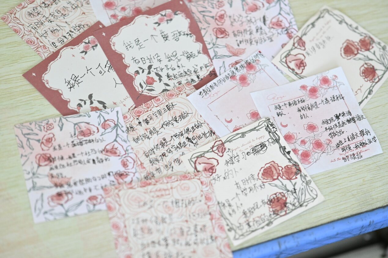 心理課上,陳詩涵老師引導(dǎo)孩子們在玫瑰花紋樣便利貼上坦誠寫下“小瑕疵”: “學(xué)習(xí)不好”、“控制不住情緒”。陳老師溫和啟發(fā):“這些‘不夠好’的一面,是否另藏著寶藏?”孩子們嘗試“和解”,寫下另一面:“我的字不好看,但我有很大進(jìn)步空間!”“我的英語差,但語文課上我表現(xiàn)很好。”筆尖沙沙,釋然與力量悄然滋生。一個(gè)孩子寫下“我很會(huì)講笑話逗樂朋友”后,嘴角悄然上揚(yáng)。