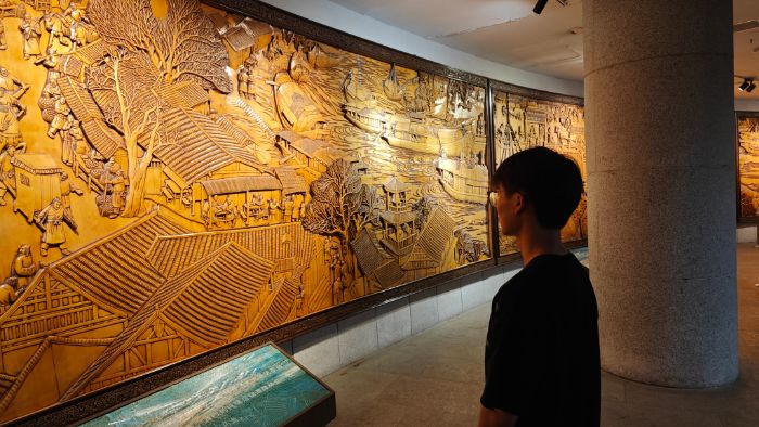 博物館中最具互動感和視覺沖擊力的展廳之一,是依據(jù)《清明上河圖》再現(xiàn)的“市井繁榮圖”。雕塑與繪畫相結(jié)合、二維與三維藝術(shù)融合,復(fù)原了大運(yùn)河淮北段的繁華景象。街市、碼頭、商販、驛道……一幅幅生動畫面躍然眼前,仿佛讓人置身隋唐盛世。