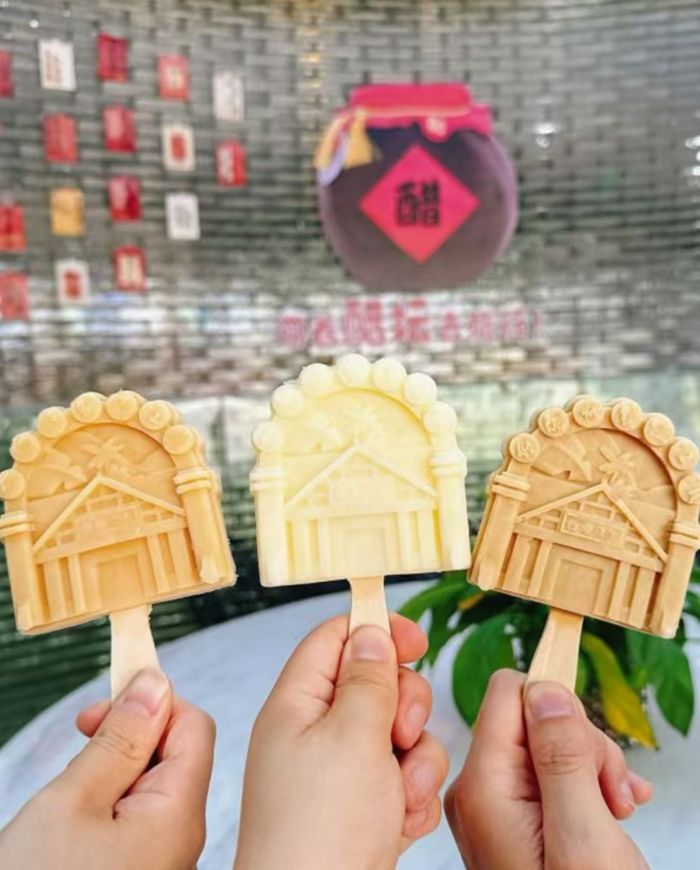 最受關(guān)注的是三款調(diào)味品雪糕:香醋味(添加6%食醋)、黃酒味(7%黃酒)和醬油芝士味(5%釀造醬油)。售價(jià)18元/支的雪糕以博物館拱形廠門為造型,其中香醋口味呈現(xiàn)出“酸而不澀,甜而不膩”的獨(dú)特風(fēng)味。“第一口有些意外,但越吃越能感受到醋香與奶香的完美平衡。”隊(duì)員們?cè)隗w驗(yàn)后紛紛表示。據(jù)工作人員介紹,這類文創(chuàng)產(chǎn)品已成為年輕游客的打卡標(biāo)配,暑期日均銷量達(dá)200余支。