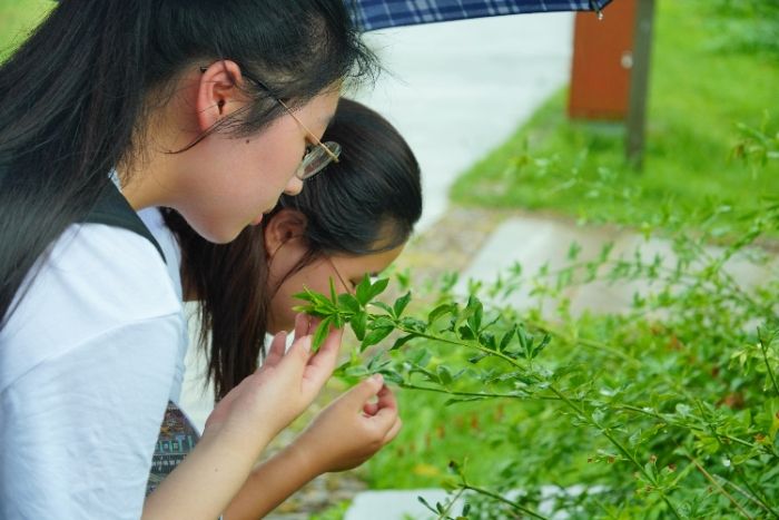 圖為團(tuán)隊(duì)成員嗅雨后樹葉 田詩(shī)穎 供圖