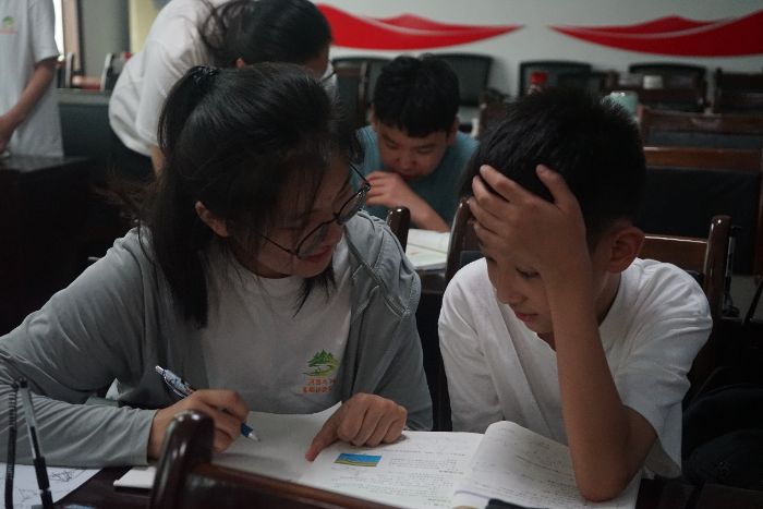 學(xué)業(yè)輔導(dǎo)也是活動(dòng)的重要環(huán)節(jié)。實(shí)踐團(tuán)成員分組為孩子們答疑解惑,針對(duì)數(shù)學(xué)難題、作文構(gòu)思、英語(yǔ)單詞記憶等進(jìn)行耐心指導(dǎo),通過啟發(fā)式提問引導(dǎo)獨(dú)立思考,助力解決學(xué)習(xí)難題,讓課堂兼具知識(shí)溫度。