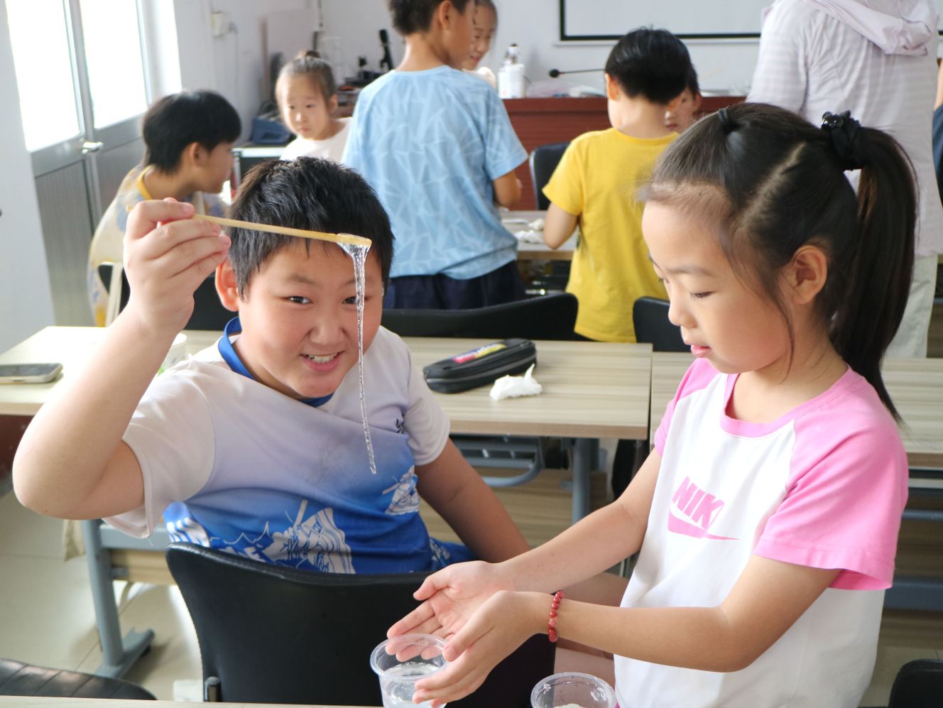 在“好玩的鼻涕蟲”課程中,實踐團成員范子龍使用聚乙烯醇、硼砂溶液等材料,帶領學生進行實驗。在講解“如何讓液體形成凝膠狀”相關原理后,學生動手操作,利用材料制作出凝膠模型。實驗過程中,有學生表示:“原來平時用的膠水里面就有這種物質。”制作完成后,現場傳出學生的歡呼聲。此次課程設計采用‘動手實踐結合知識學習’的方式,旨在幫助學生理解物質變化過程。
