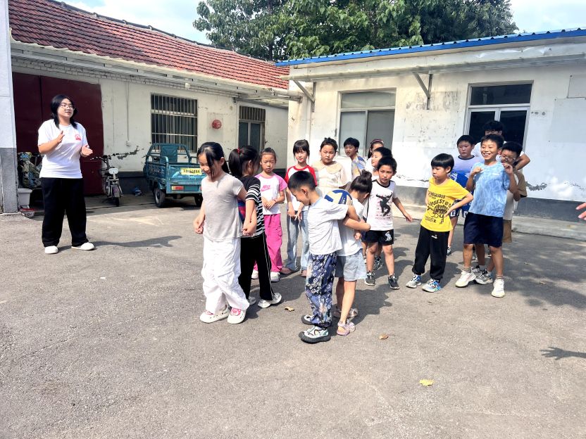 紅色課程結束后,實踐團成員張舒涵、曹孟肖、孫銘悅帶領孩子們回顧《左手右手》這首歌。他們先播放歌曲旋律,引導學生跟著哼唱,隨后為歌曲設計了一系列貼合歌詞意境的動作——當唱到“當你的手拉著我的手”時,孩子們兩兩相握。成員們耐心講解每個動作的要領,糾正孩子們的姿勢,鼓勵他們邊唱邊做,為后續(xù)的唱歌演出打下基礎。