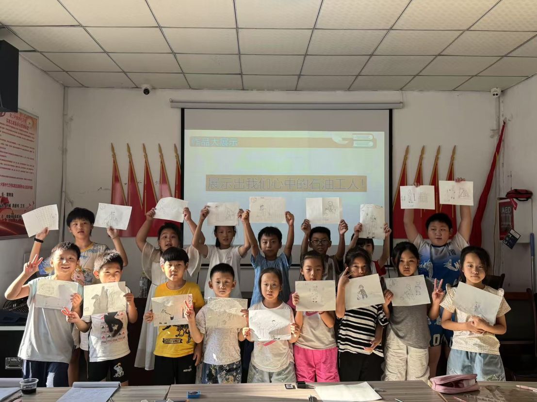 在“‘我心中的石油工人’主題繪畫”課程中,實踐團成員孫銘悅、曹孟肖向學生分發(fā)繪畫工具,組織創(chuàng)作石油工人主題作品,引導學生用色彩描繪心中的石油工人形象。有的畫戴著安全帽的工人在鉆井平臺上忙碌,有的畫石油管道通向遠方,每一幅作品都充滿童真與敬意。