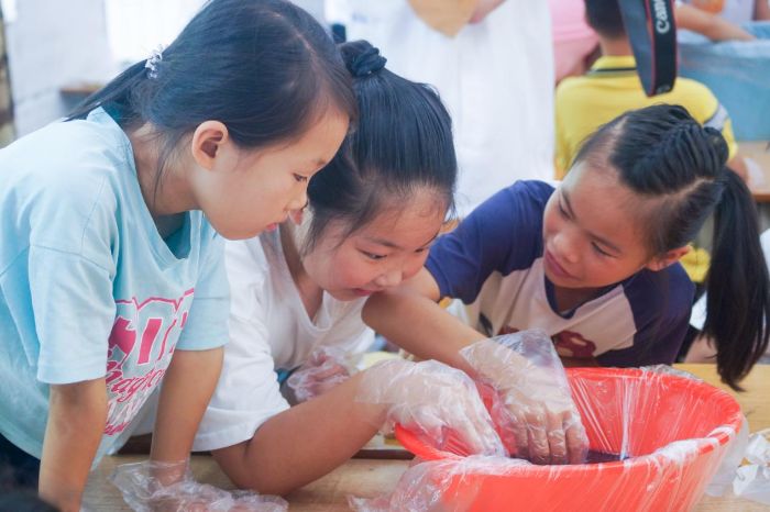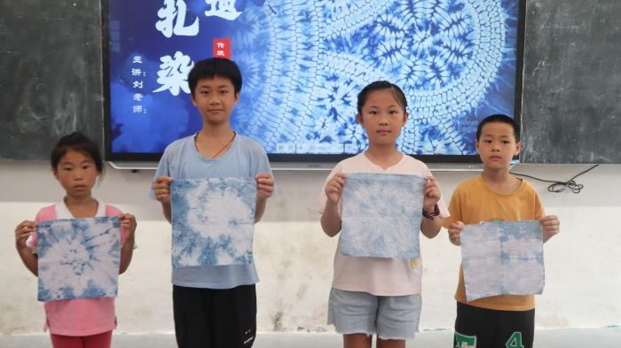 實踐環(huán)節(jié),支教組提供標準化材料(純棉白布、藍靛染料、皮筋、塑料盆等),學生按步驟操作:先將棉布充分浸濕,再根據(jù)設(shè)計需求進行折疊、纏繞、捆扎,隨后浸入染料靜置規(guī)定時長,最后拆去捆扎物完成作品。