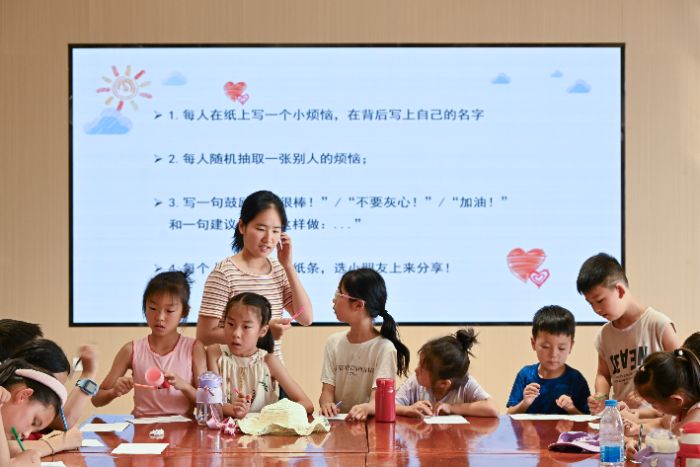 隨后進(jìn)入“直面情緒”環(huán)節(jié),在“煩惱幫幫樂”游戲中,孩子們將自己的小煩惱寫在紙上,再在其他同學(xué)的煩惱上留言,為他們送上一句暖心的鼓勵(lì)或建議。煩惱從“我考試沒考好”到“我和朋友吵架了”,孩子們用最真誠(chéng)的話語回應(yīng)、鼓勵(lì)彼此。