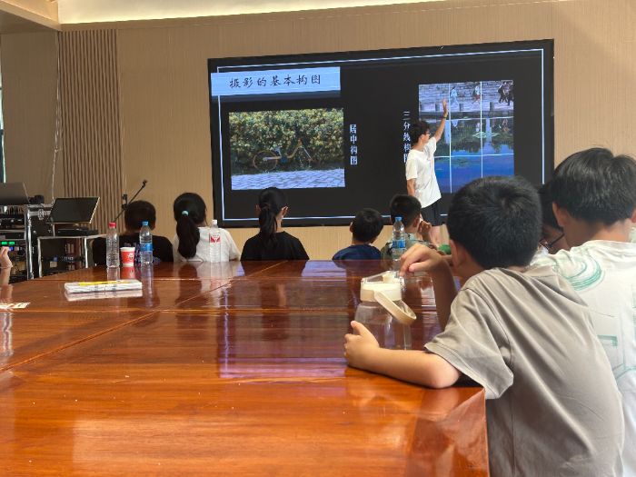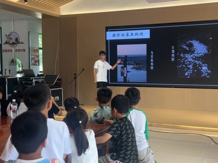 隨后的課程重點介紹了多種實用構(gòu)圖技巧,如引導(dǎo)視覺焦點的“九宮格構(gòu)圖法”、展現(xiàn)穩(wěn)定與莊重的“對稱式構(gòu)圖”、創(chuàng)造動感與延伸感的“對角線構(gòu)圖”以及營造空間意境美的“留白構(gòu)圖”等。支教老師結(jié)合自己拍攝的照片實例進行講解,引導(dǎo)孩子們觀察畫面布局之美。