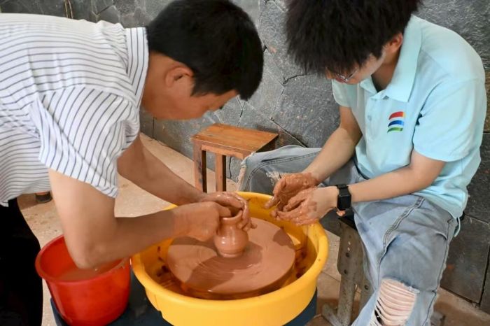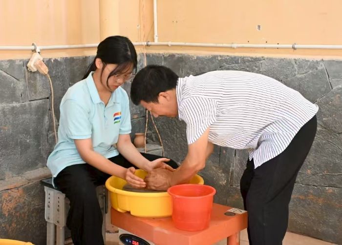 體驗環(huán)節(jié)中,實踐團成員們在左老師的耐心指導下嘗試制陶。看似簡單的轉(zhuǎn)盤操作,實則考驗著對力度、平衡與手感的精準把控。親身體驗后,大家才深刻體會到“臺上一分鐘,臺下十年功”的含義——每一次捏塑的角度、轉(zhuǎn)盤的轉(zhuǎn)速、燒制的溫度,都藏著左老師制陶多年的心得。